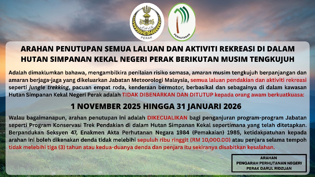 ARAHAN PENUTUPAN SEMUA LALUAN DAN AKTIVITI REKREASI DI DALAM HUTAN SIMPAN KEKAL NEGERI PERAK BERIKUTAN MUSIM TENGKUJUH Terakhir dikemaskini: 10 Oktober 2025