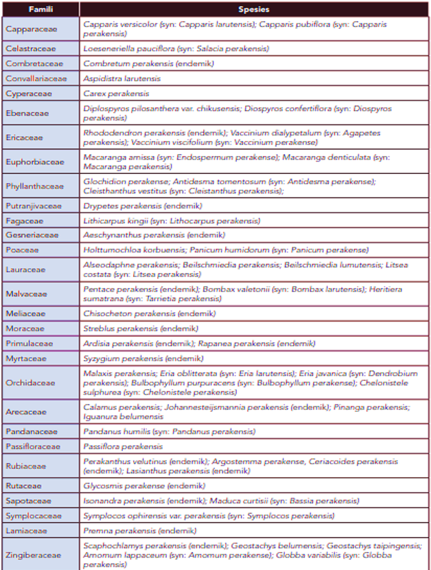 Sebanyak 1,171 taksa merupakan spesies endemik Malaysia. Sebanyak 314 spesies (28.5%; atau 334 taksa) merupakan tumbuhan vaskular yang endemik kepada negeri Perak sahaja (Jadual 3.4.3) dan kumpulan tumbuhan ini amat penting untuk dipelihara bagi memastikan kelangsungan spesies-spesies ini. Ringkasan bilangan tumbuhan vaskular yang endemik kepada Perak sahaja. |